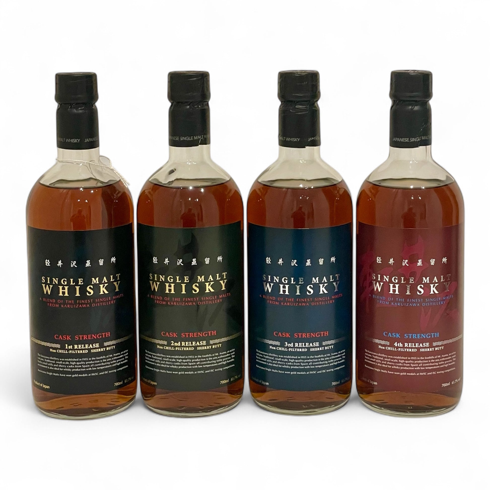 four bottles of Karuizawa Cask Strength Japanese Single Malt Whisky. Each bottle in this series was produced from Karuizawa's final two vintages, 1999 and 2000, matured in sherry butts and are bottled at cask strength: